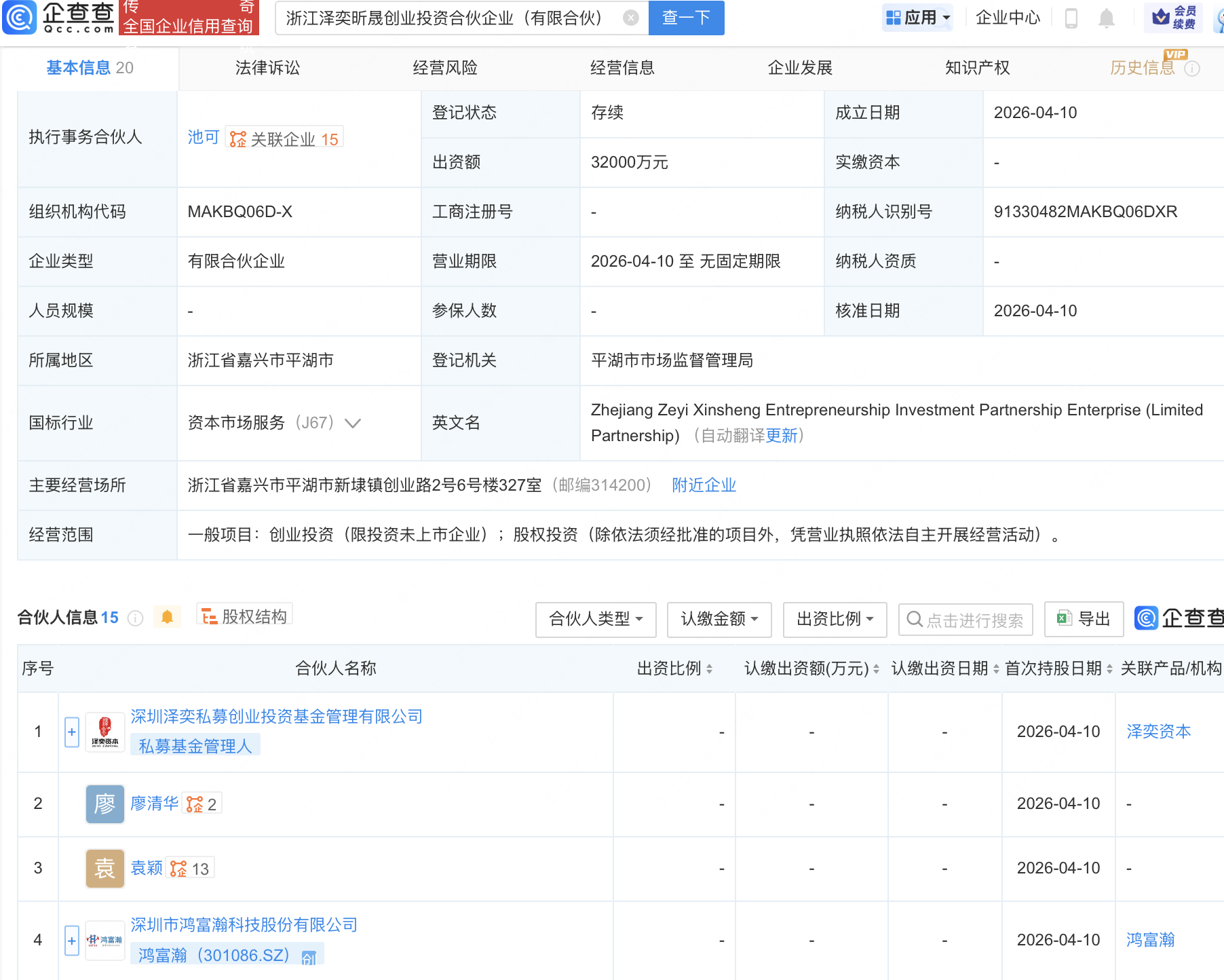 近日,浙江泽奕昕晟创业投资合伙企业(有限合伙)成立,出资额3.2亿元,经营范围包含:创业投资(限投资未上市企业);股权投资。企查查股权穿透显示,该企业由鸿富瀚(301086)等共同出资。